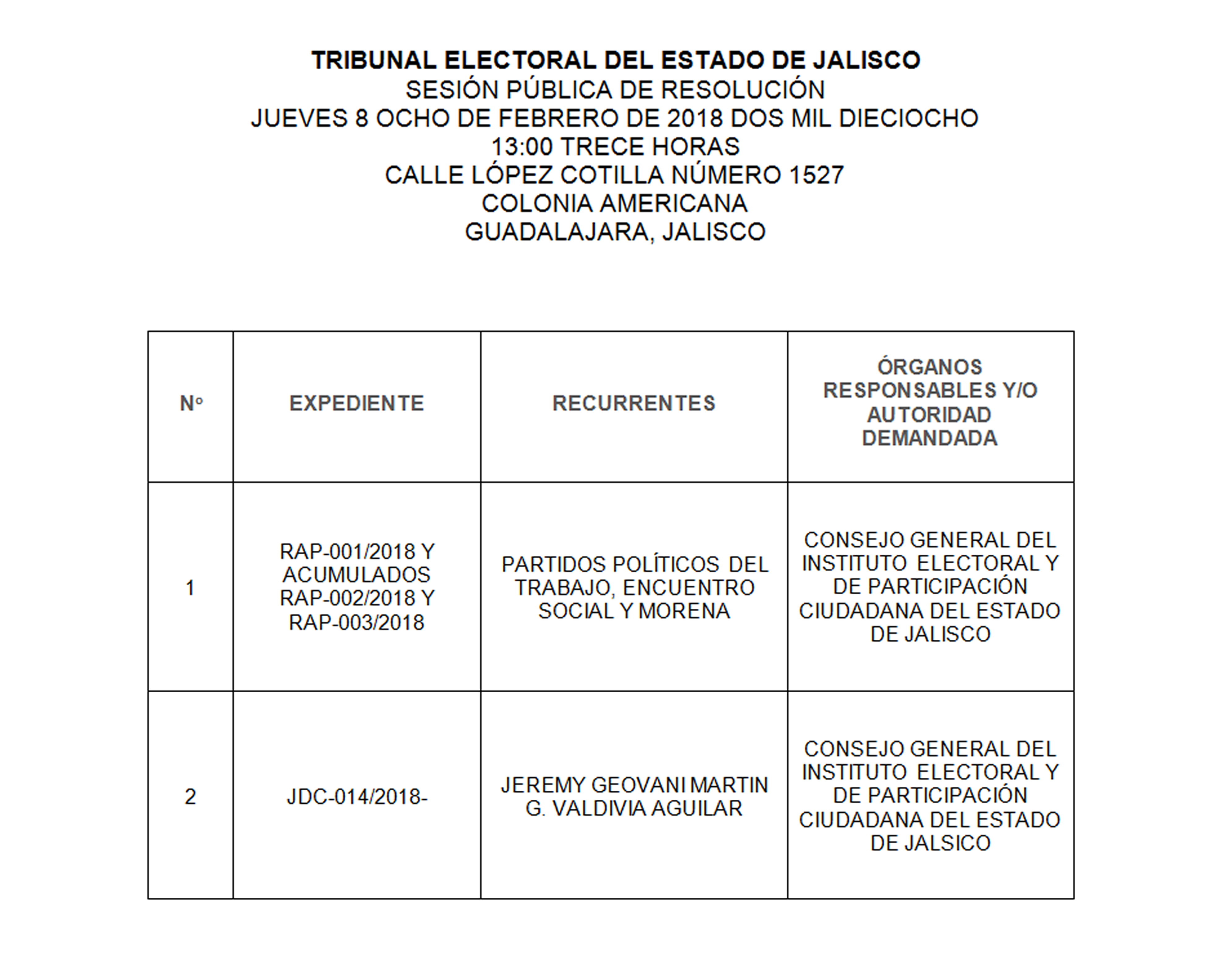 Sesión Pública de Resolución, jueves 08 de febrero 2018.