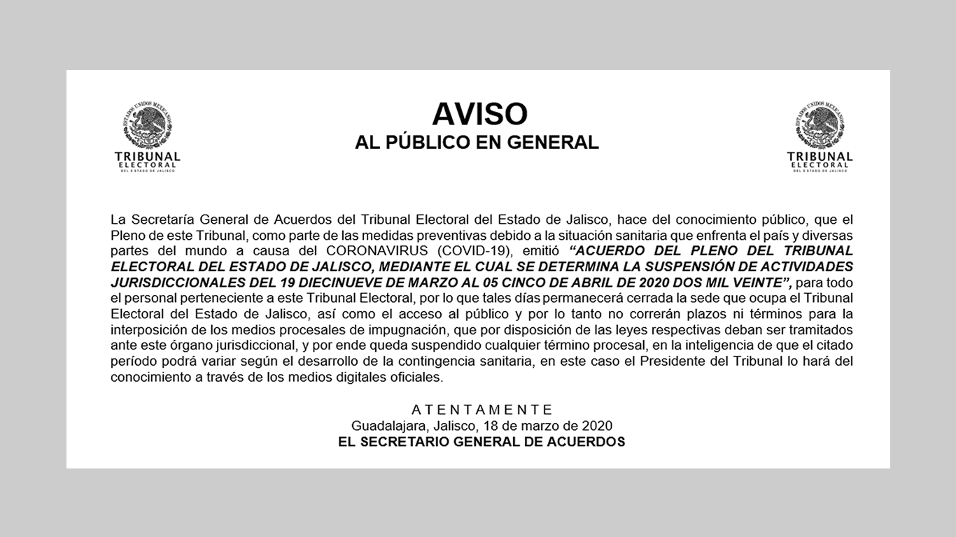 ACUERDO DEL PLENO DEL TRIBUNAL ELECTORAL DEL ESTADO DE JALISCO, MEDIANTE EL CUAL SE DETERMINA LA SUSPENSIÓN DE ACTIVIDADES JURISDICCIONALES DEL 19 DIECINUEVE DE MARZO AL 05 CINCO DE ABRIL DE 2020 DOS MIL VEINTE”