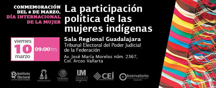 La Sala Regional Guadalajara del Tribunal Electoral del Poder Judicial de la Federación, el Tribunal Electoral del Estado de Jalisco, el Instituto Electoral y de Participación Ciudadana del Estado de Jalisco, el Instituto Jalisciense de las Mujeres, la Comisión Estatal Indígena, el Observatorio de la Participación Política de las Mujeres organizadores del foro: “La Participación Política de las Mujeres Indígenas”, en el marco de la conmemoración del Día Mundial de la Mujer.