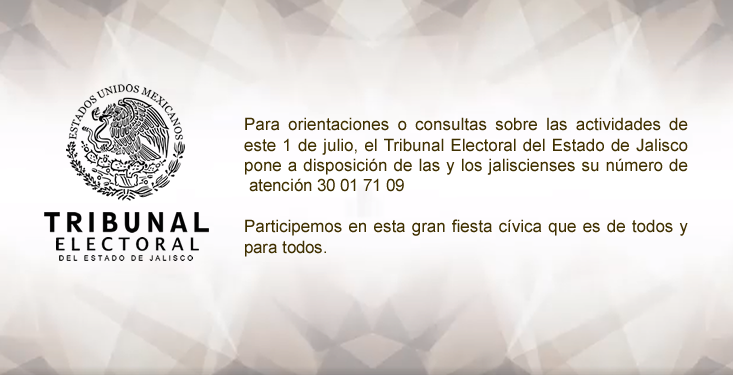 Para orientaciones o consultas sobre las actividades de este 1 de julio, el Tribunal Electoral del Estado de Jalisco pone a disposición de las y los jaliscienses su número de atención 30 01 71 09